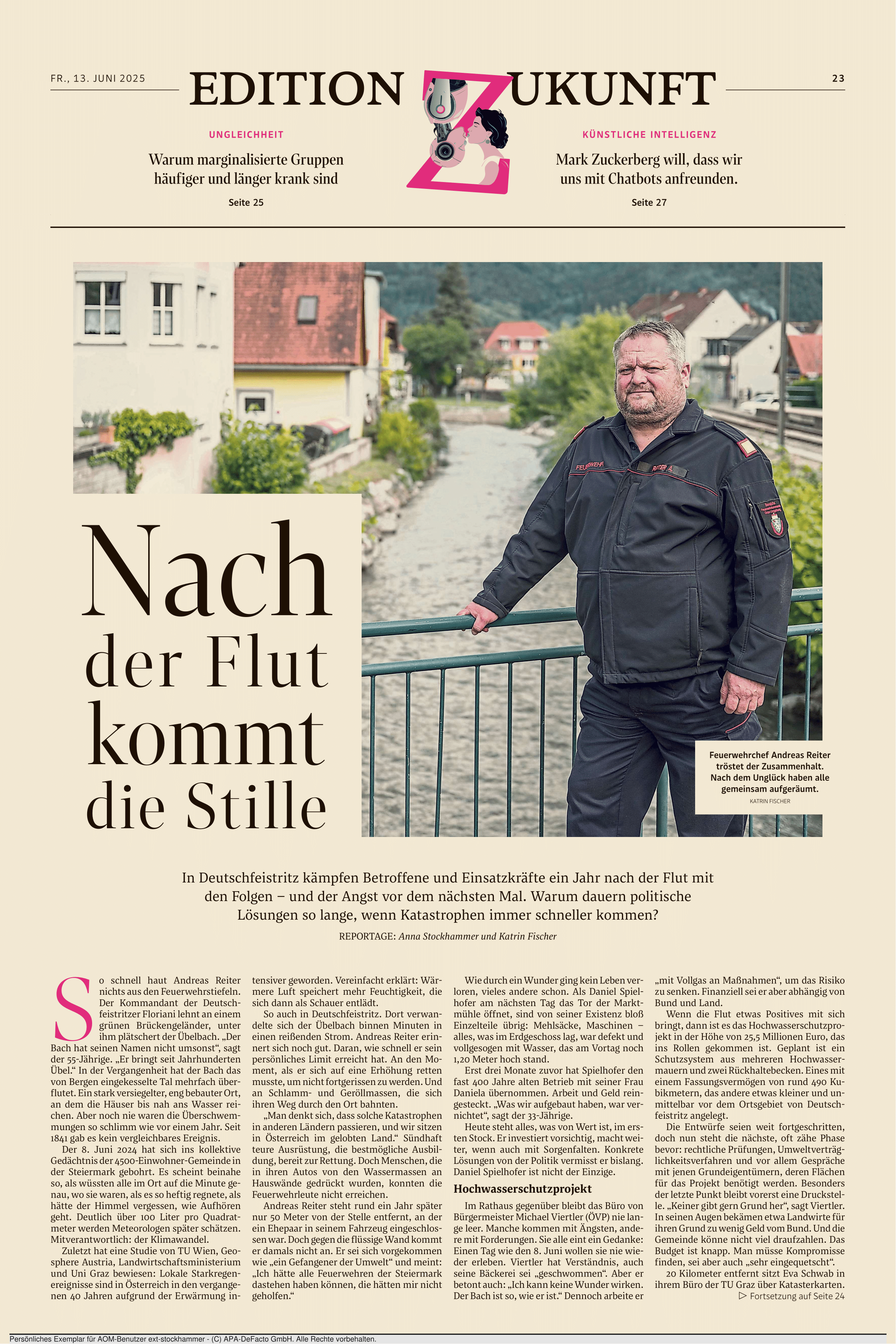 So schnell haut Andreas Reiter nichts aus den Feuerwehrstiefeln. Der Kommandant der Deutschfeistritzer Floriani lehnt an einem grünen Brückengeländer, unter ihm plätschert der Übelbach. „Der Bach hat seinen Namen nicht umsonst“, sagt der 55-Jährige. „Er bringt seit Jahrhunderten Übel.“ In der Vergangenheit hat der Bach das von Bergen eingekesselte Tal mehrfach überflutet. Ein stark versiegelter, eng bebauter Ort, an dem die Häuser bis nah ans Wasser reichen. Aber noch nie waren die Überschwemmungen so schlimm wie vor einem Jahr. Seit 1841 gab es kein vergleichbares Ereignis.